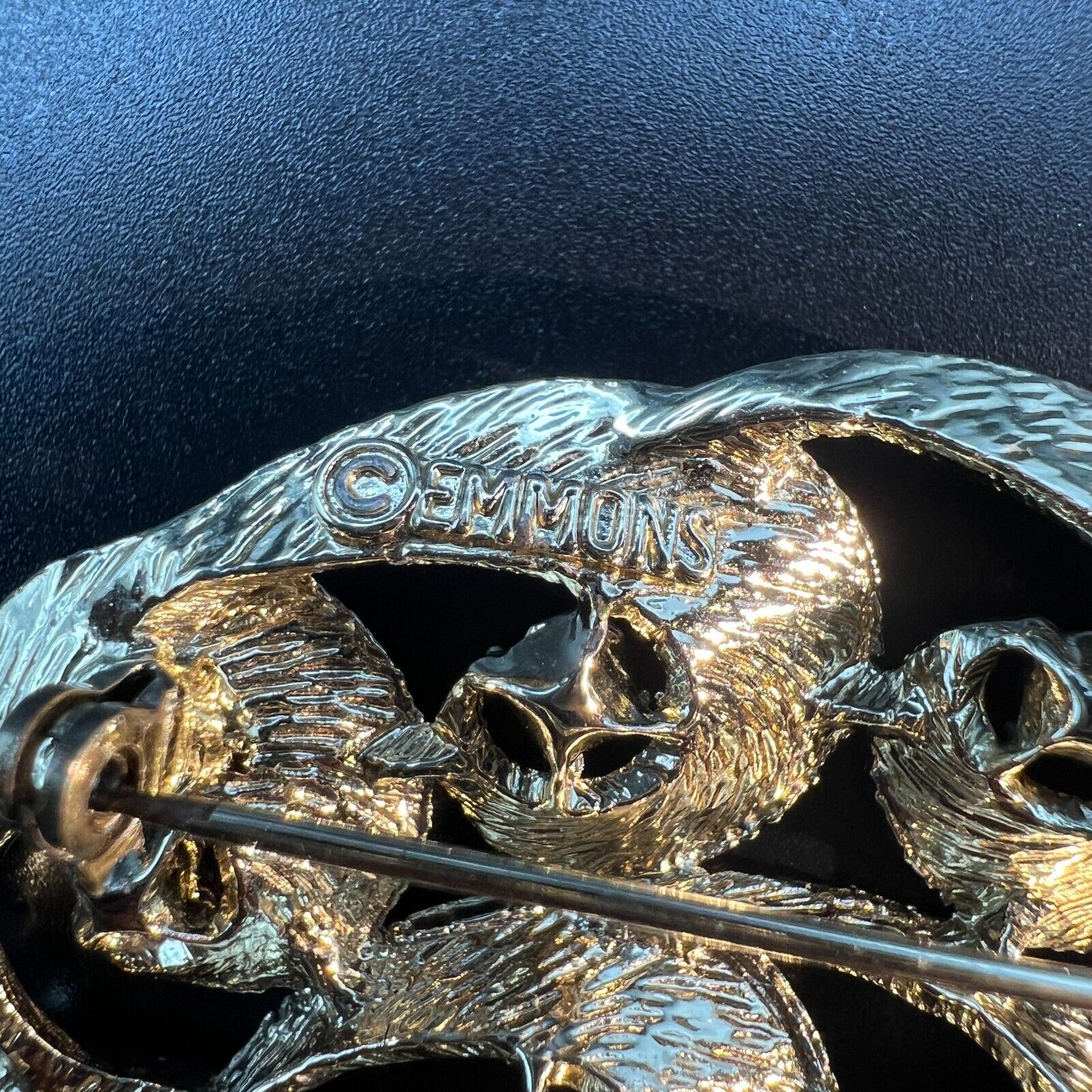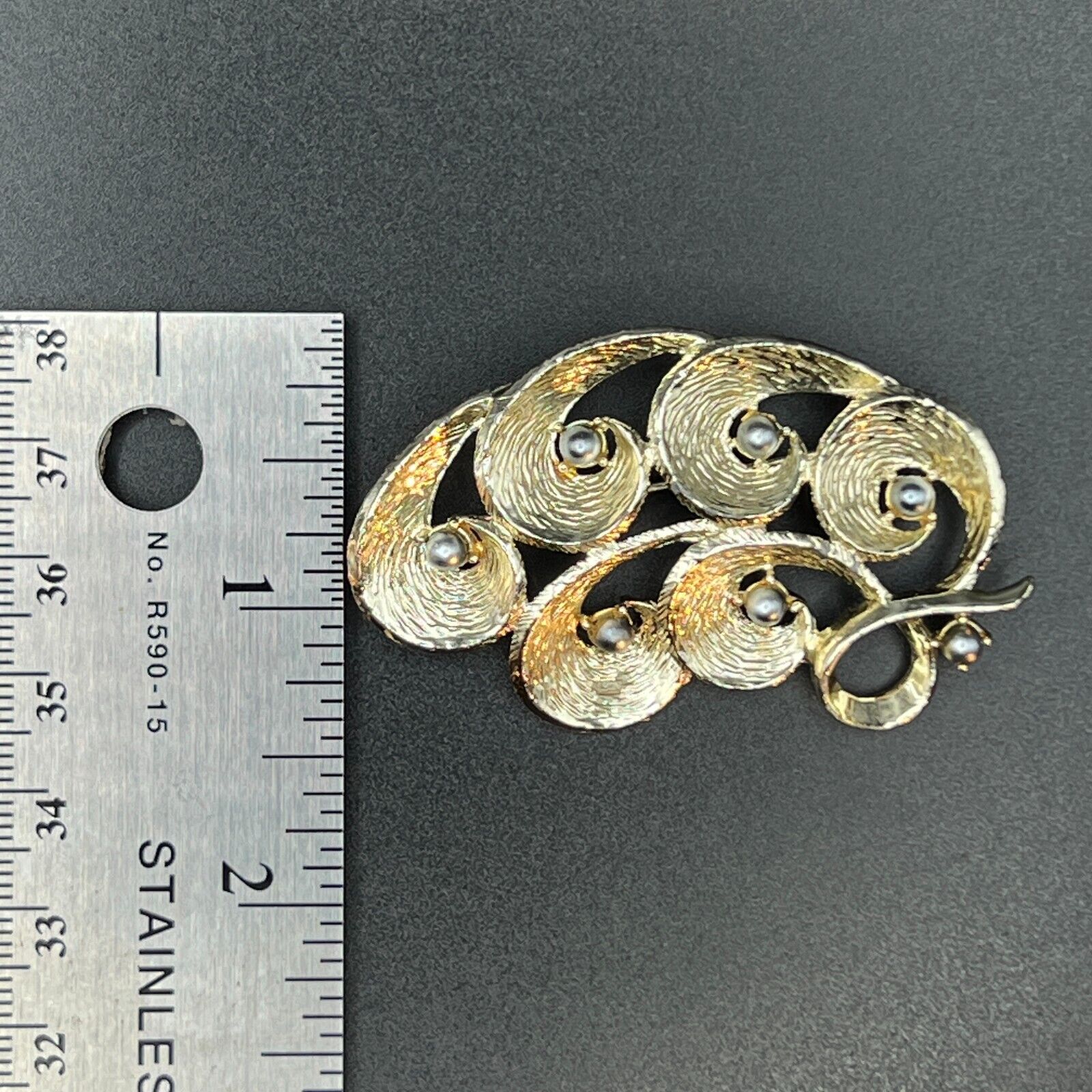 This vintage brooch pin is signed by Emmons and features a gold-toned design with faux gray pearls. The classic round imitation pearls add a touch of elegance to the piece, making it a timeless addition to any jewelry collection. Measures at 2.25" x 1.5".